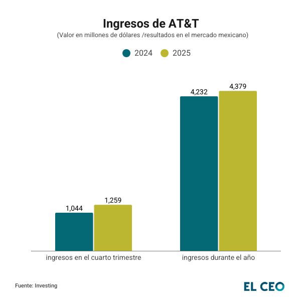 El crecimiento que tuvo AT&T en el mercado mexicano refleja la expansión que alcanzó durante 2025 a nivel global, donde logró incrementar sus ingresos y ampliar su cartera de clientes con su servicio de telefonía móvil.