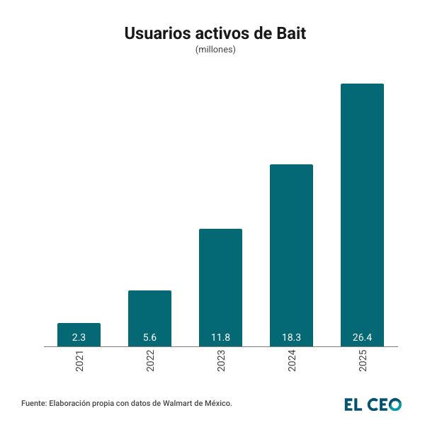 No obstante, según el conteo del propio Walmart de México, Bait cerró 2025 con 26.4 millones de usuarios activos.