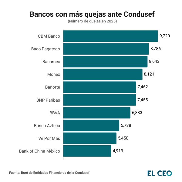 Según la información de la comisión, la institución con mayor número de reclamaciones fue CBM Banco, integrante del Grupo Financiero Citi, con un total de 9,720 quejas, de las cuales 9,703 se concentraron entre mayo y septiembre de 2025.