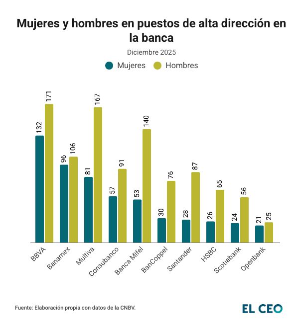 BanCoppel tiene 30 mujeres en alta dirección y 76 hombres; le sigue Santander, con 28 mujeres y 87 hombres en esos cargos; HSBC, con 26 mujeres y 65 hombres; Scotiabank, con 24 mujeres y 56 hombres; y Openbank, el banco digital de Santander, con 21 mujeres y 25 hombres, añaden datos de la CNBV.