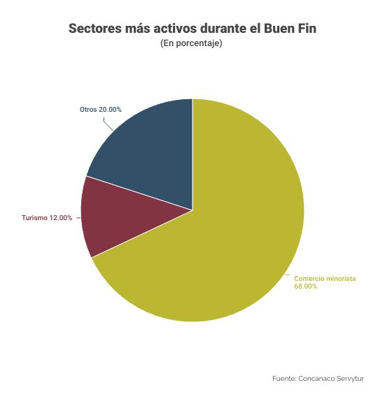 La Concanaco Servytur apuntó que los sectores que mayor participación tuvieron en El Buen Fin 2025 fueron los de negocio minorista con 68% de la actividad reportada; por su parte, el turismo y los servicios representaron 12%.