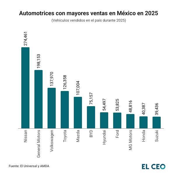 El crecimiento que registró BYD durante el año pasado lo colocó como la sexta automotriz con mayores ventas en la industria mexicana, según datos de la Asociación Mexicana de Distribución de Automotores (AMDA), tan sólo detrás de empresas como: