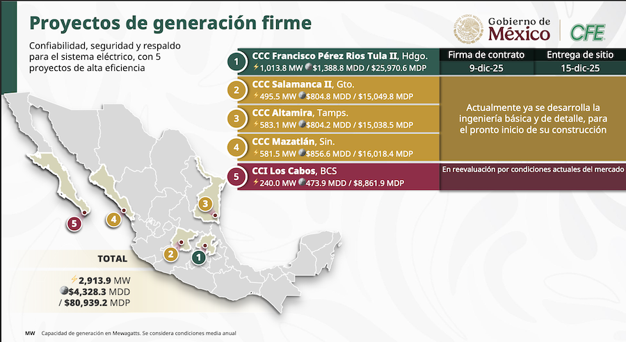 En conjunto, estos proyectos sumarán 2,913.9 megawatts de capacidad instalada, con una inversión equivalente a 80,939 millones de pesos, considerando el tipo de cambio del Presupuesto de Egresos de la Federación 2025.