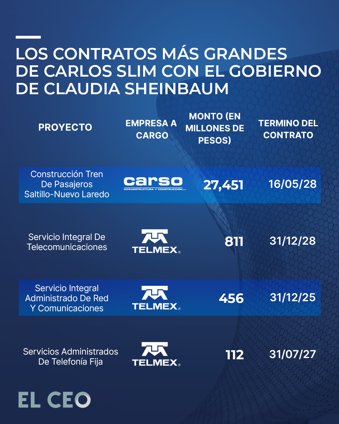 De acuerdo con una revisión realizada por EL CEO en el portal de Compras MX, Teléfonos de México (Telmex) y Carso Infraestructura y Construcción (CICSA) son las dos empresas del magnate mexicano —quien este martes celebró su cumpleaños número 86—, que han ganado los contratos más lucrativos en el sexenio actual, principalmente en el sector de obras públicas.