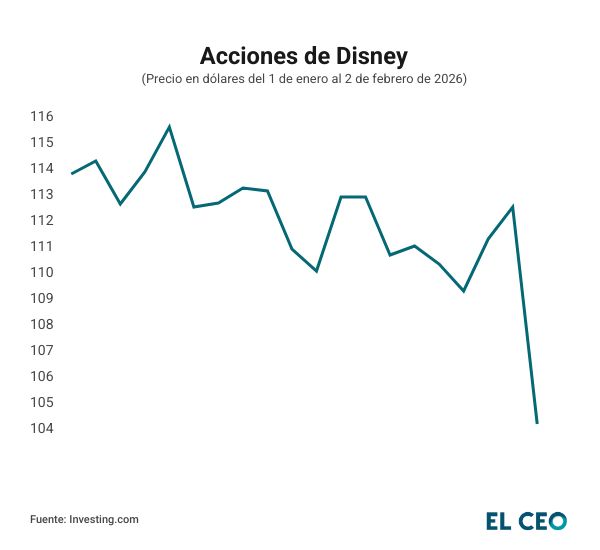Luego del anuncio del nuevo CEO, las acciones de Disney iniciaron las operaciones a la baja con una pérdida de 0.87%, a 103.75 dólares (Ciudad de México, 8:34 horas), según datos de Investing. Al cierre de este lunes, los títulos de la empresa acumulan una caída de 8.19% en lo que va del 2026.