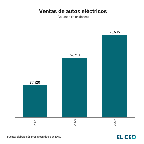 De acuerdo con la Electro Movilidad Asociación (EMA), en ese año se registró la venta de 96,636 unidades de vehículos 100% eléctricos (VE), híbridos conectables (PHEV) y de rango extendido eléctricos (REEV).