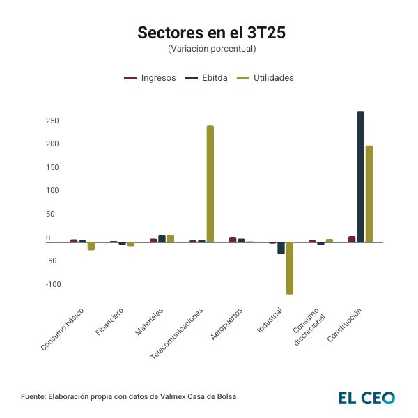 Del lado opuesto de la moneda, hay tres sectores que mostraron los resultados más débiles del trimestre: industrial, financiero y de consumo. El primero, que engloba empresas como Orbia y Grupo Carso, registró caídas porcentuales en ingresos, Ebitda y utilidades.