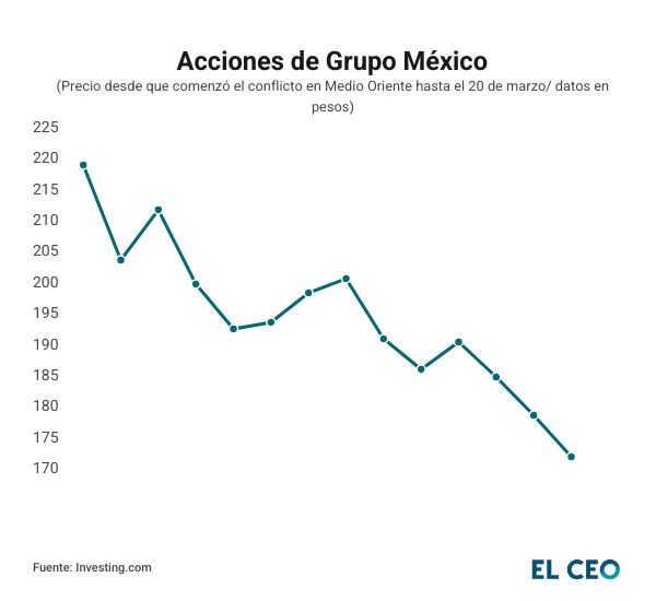 Desde que se desencadenó el conflicto bélico el pasado 28 de febrero y hasta el cierre de operaciones de este viernes, las acciones de la empresa de Germán Larrea acumulan una caída de 19.96%, al cotizar en 173.21 pesos.