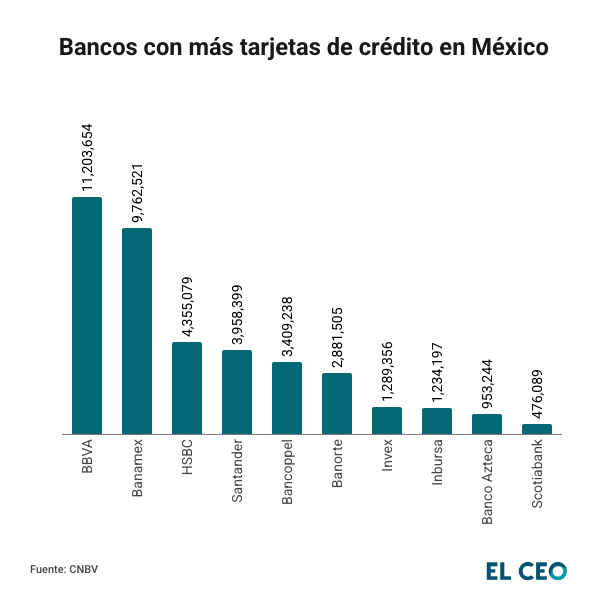 Los datos de la CNBV indican que BBVA se consolidó como el banco con más tarjetas de crédito, al contar con más de 11.2 millones de clientes y al sumar estos 12 meses 1.3 millones de plásticos nuevos.