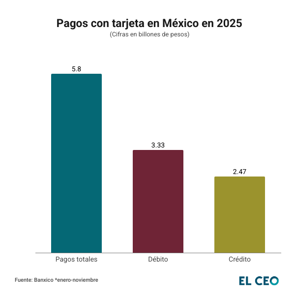 Datos del Banco de México (Banxico) indican que entre enero y noviembre de 2025 el monto operado con tarjetas superó los 5.8 billones de pesos, un crecimiento de 13.7% respecto al mismo periodo del año pasado.