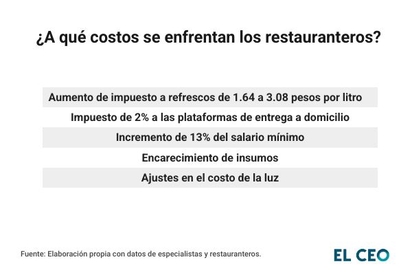 Los restaurantes enfrentan mayores costos en parte por el alza de impuestos de 1.64 a 3.08 pesos por litro para bebidas endulzadas como refrescos a partir de enero de este año, así como de 2% a las plataformas de entrega a domicilio, además del aumento al salario mínimo de 13% en la mayor parte del país para los trabajadores.