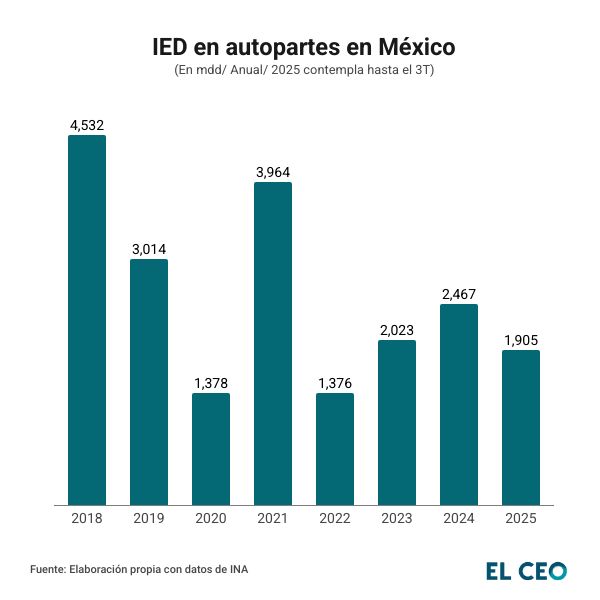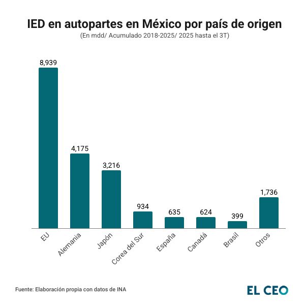 De hecho, entre 2018 –año en el que se reportó el mayor monto de IED para el segmento de autopartes– y el tercer trimestre de 2025, el mayor monto provino de Estados Unidos, con 8,939 millones de dólares.