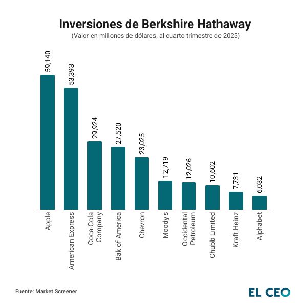 De acuerdo con Market Screener, pese a la reducción de su participación en el último trimestre de 2025, Apple sigue siendo la empresa donde el conglomerado concentra mayor inversión, la cual está valuada en los 59,140 mdd.