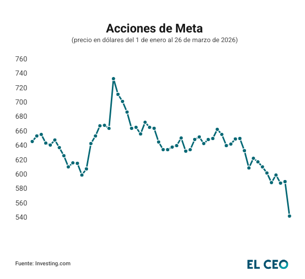 Tras el veredicto, los inversionistas reaccionaron de forma negativa en el mercado, por lo que las acciones de Meta registraron una caída de 8.10%, ubicándose en 546.82 dólares por título (Ciudad de México, 12:49 horas), de acuerdo con datos de Investing.