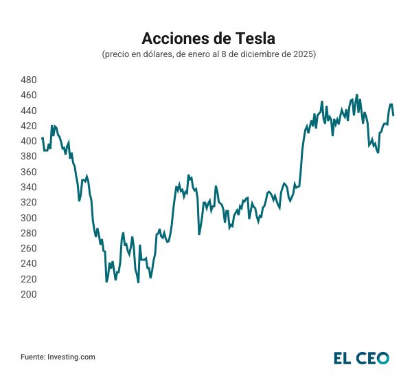Este año ha sido volátil para las acciones de Tesla, ya que este 2025 han subido alrededor de 10% después de aumentar 63% en 2024 y 102% en 2023.