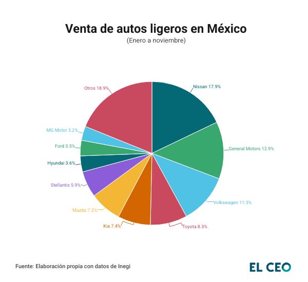 En el acumulado enero-noviembre, Nissan mantuvo su lugar como el mayor vendedor del mercado mexicano. En este periodo, las ventas sumaron 245,182 unidades, lo que equivale a una participación de 17.9%.