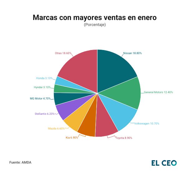 De acuerdo con la AMDA, la marca que lideró las ventas durante el primer mes del año fue la japonesa Nissan, con el 18.8% del total, cerca de 24,716 vehículos distribuidos.