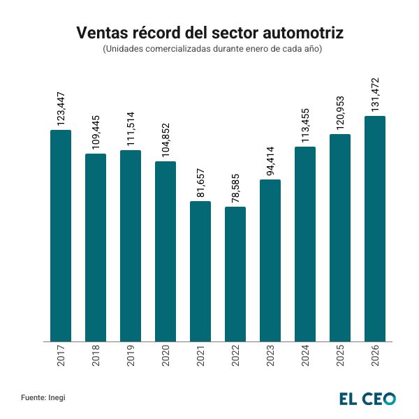 La industria automotriz de México reportó ventas récord en enero de 2026 al comercializar 131,472 vehículos ligeros, de acuerdo con cifras del Instituto Nacional de Estadística y Geografía (Inegi).