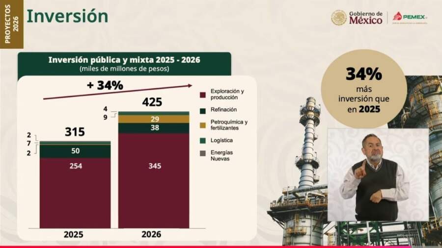 El director de Petróleos Mexicanos (Pemex), Víctor Rodríguez Padilla señaló que la inversión pública y mixta de la petrolera para este año estaría alcanzando los 425,000 millones de pesos (mdp), un incremento de 34% respecto a los 315,000 mdp de 2025. Gran parte de la estrategia de la petrolera se estaría sosteniendo de los contratos conjuntos con la iniciativa privada.