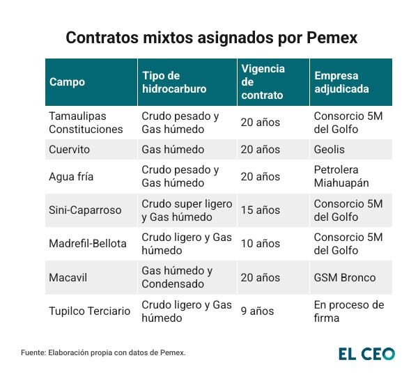 Además de los tres campos asignados a Consorcio 5M del Golfo y el pendiente de firma, los otros tres fueron otorgados de la siguiente manera: