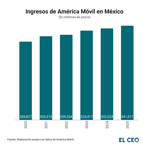 En tanto, los ingresos totales de América Móvil en México ascienden a 341,617 millones de pesos durante 2025, lo que fue 2.9% más frente al año previo.
