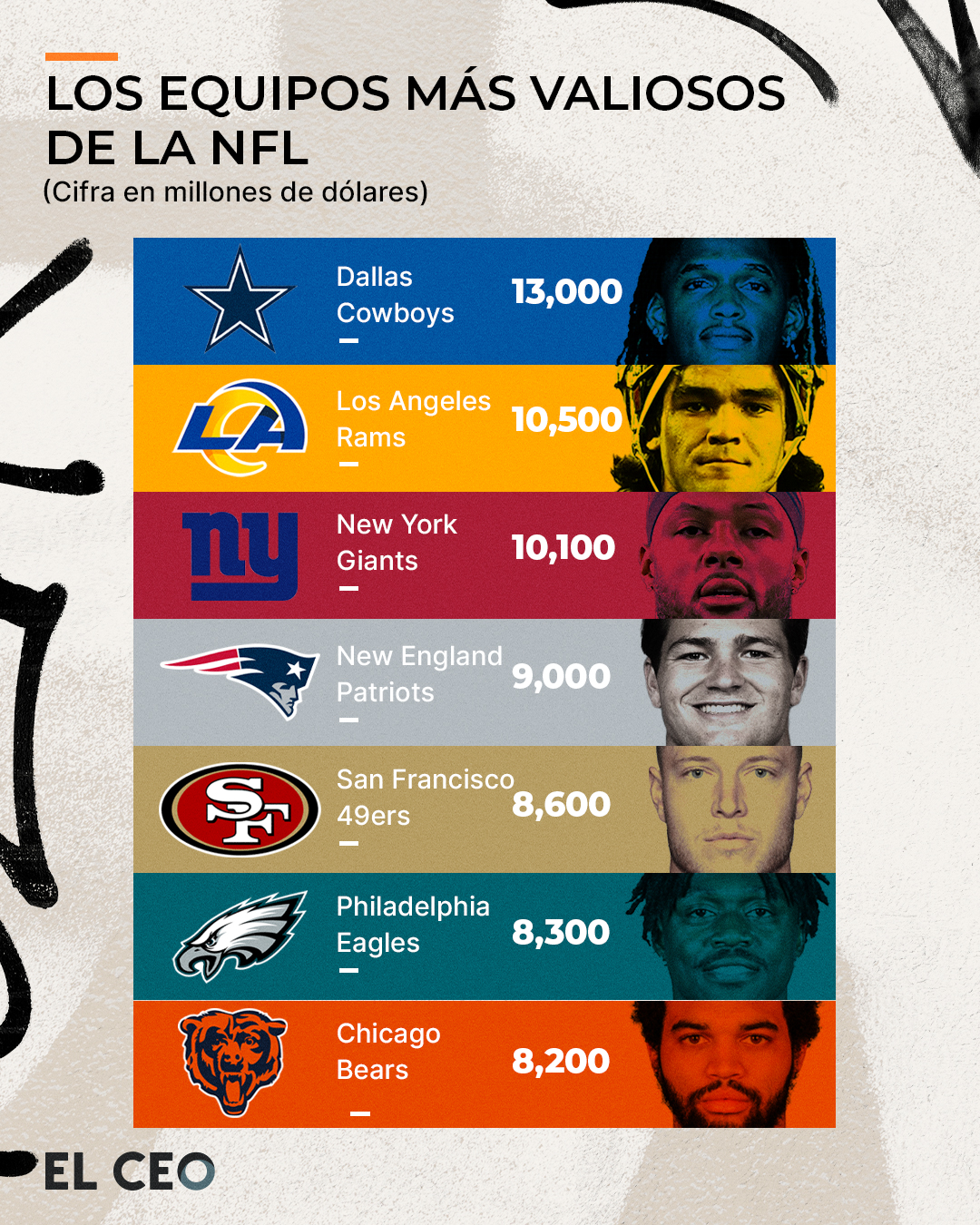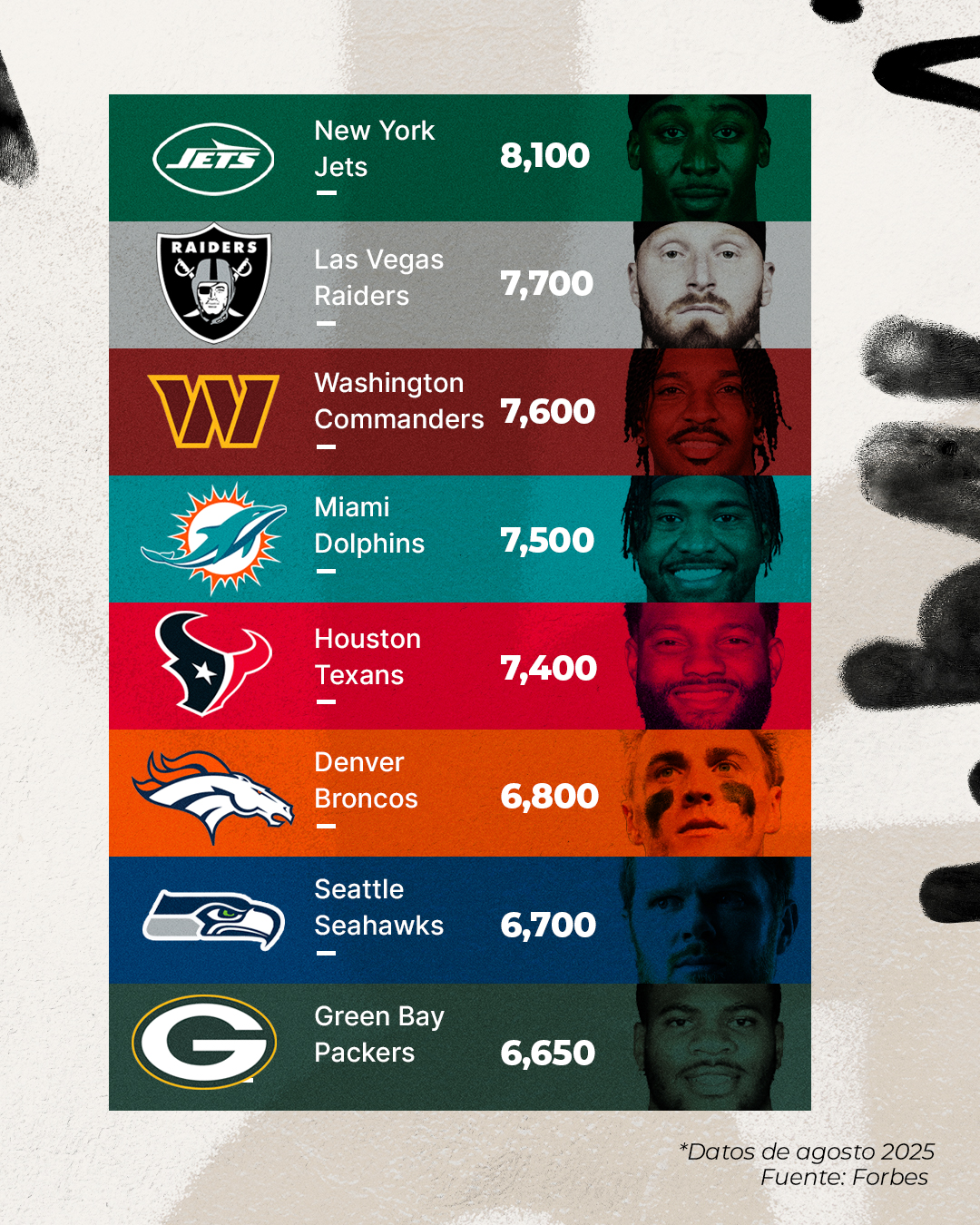 Por su parte, los New England Patriots se colocan como el cuarto equipo más valioso de la NFL, con una valuación de 9,000 millones de dólares, según Forbes.