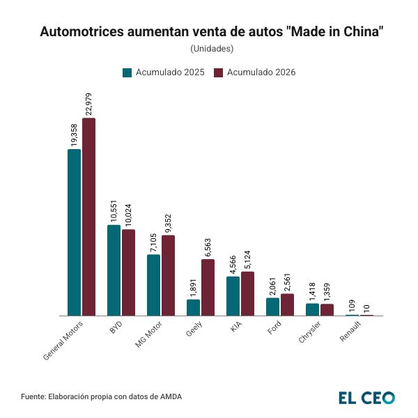 En contraste, Renault redujo la venta de sus unidades chinas en 90.8%, al pasar de 109 en 2025 a 10 en 2026.