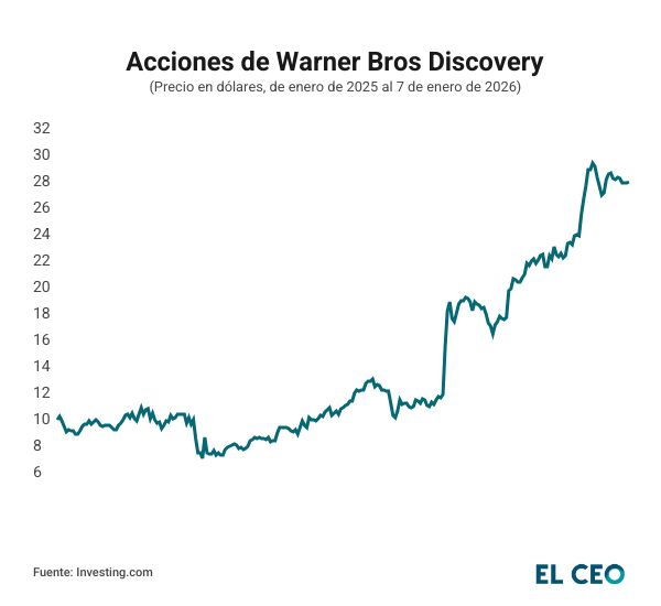 Por su parte, Warner Bros Discovery inició la sesión de este miércoles con una ligera alza de 0.09%, a 28.50 dólares. Desde que anunció sus intenciones de venta en septiembre de 2025, los títulos de la empresa cinematográfica acumula una ganancia de 145.19%, desde que anunció sus intereses de venta en septiembre.