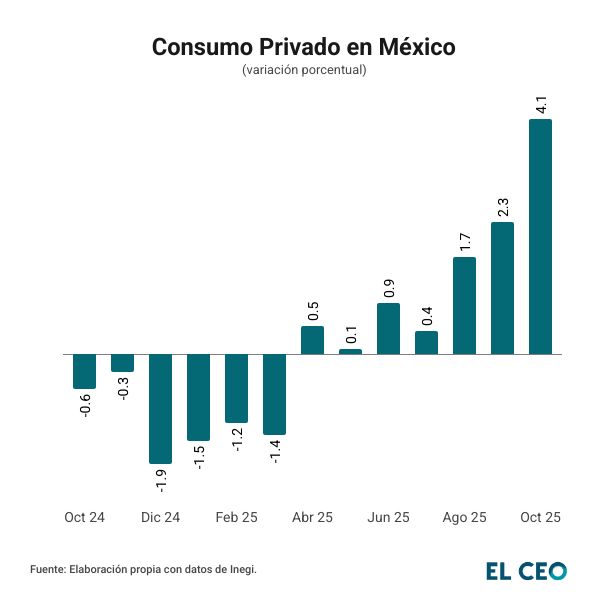 Datos del Inegi revelan que en octubre mostró un crecimiento de 4.1% anual, con lo que ligó seis meses a la alza, y por lo que se pudo apreciar es que este repunte se debe a los bienes importados ante la apreciación del peso mexicano, según el Indicador Mensual de Consumo Privado.