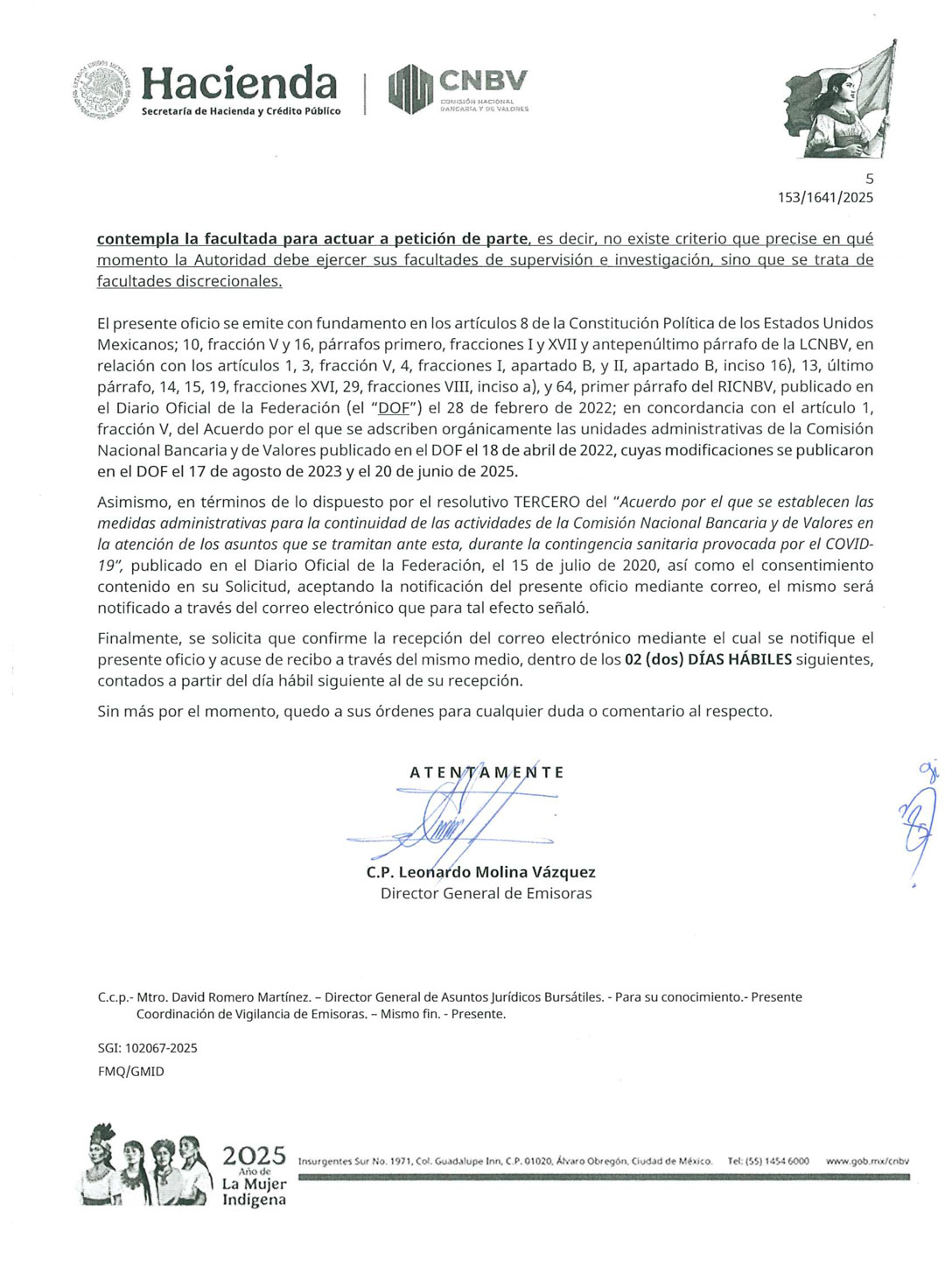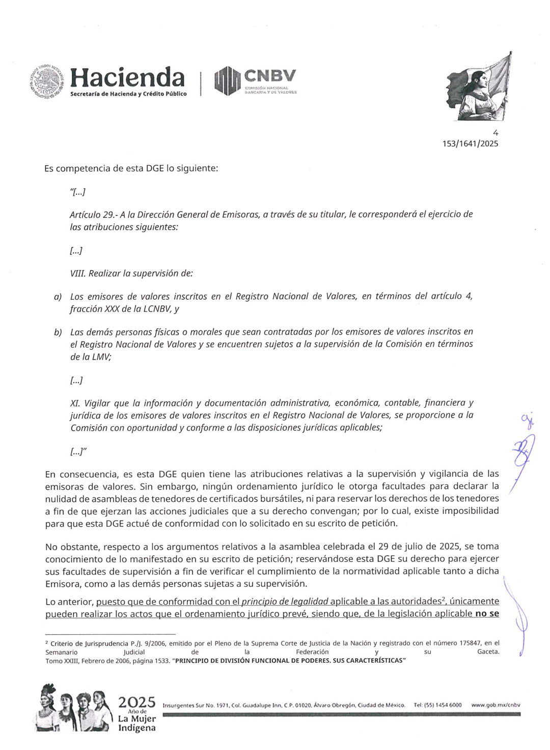 La novedad es que la respuesta llegó. En un oficio firmado por Leonardo Molina, director general de Emisoras de la Vicepresidencia de Supervisión Bursátil, la CNBV sostiene que no tiene facultades para declarar la nulidad de asambleas, aun cuando existan evidencias de irregularidades en su celebración.