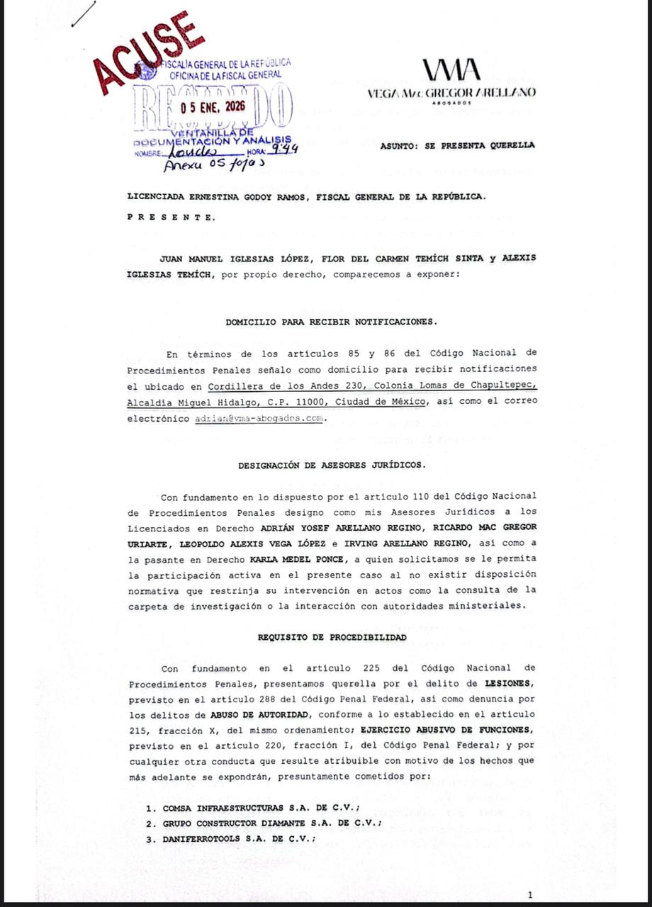 El abogado Adrián Arellano Regino, parte del bufete Vega Mac Gregor Arellano, acudió a la Fiscalía General de la República (FGR) en representación de tres víctimas, donde presentó la denuncia por los delitos de lesiones, abuso de autoridad y ejercicio abusivo de autoridad.