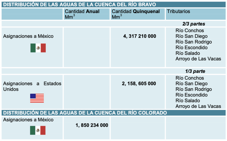 Dicho pacto establece la asignación de las aguas de los ríos Bravo y Colorado de la siguiente manera: