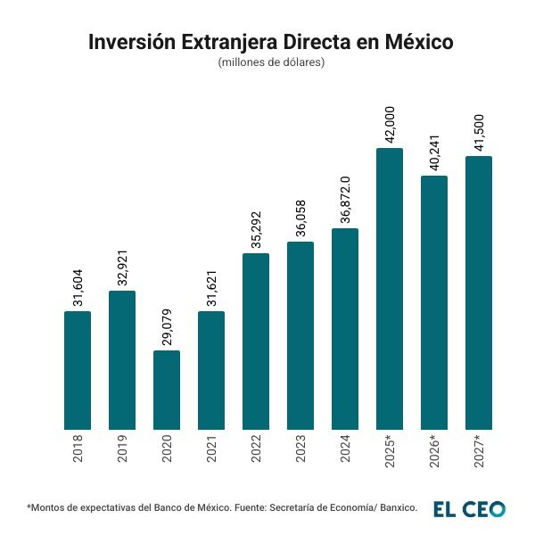 Según la encuesta de expectativas de los Especialistas en Economía del Sector Privado del Banco de México (Banxico), para el 2026 esperan que haya una Inversión Extranjera Directa de 40,241 millones de dólares, menor que la esperada para el 2025 que es de 42,000 millones de dólares.
