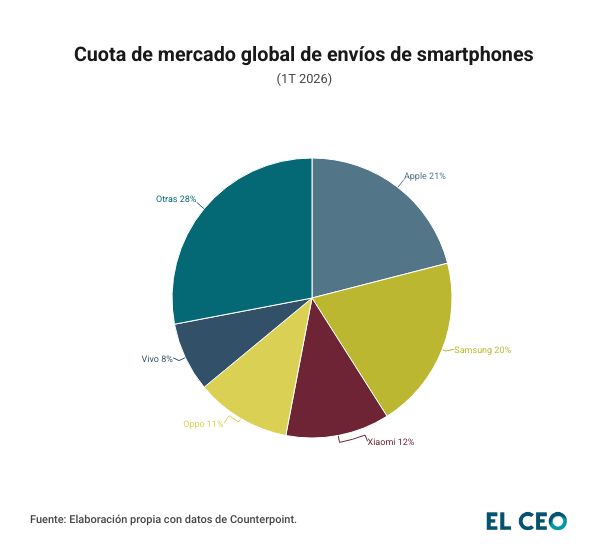 La segunda posición es para Samsung con una participación de mercado de 20% y una disminución interanual de 6%, la surcoreana ha debido lidiar con una menor demanda en el segmento de consumo masivo y el retraso del lanzamiento de la serie S26. Sin embargo, una vez salió al mercado dicha serie, registró una sólida demanda.