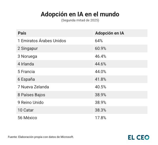El país ocupa el lugar 56, con una proporción de 17.8% de la población económicamente activa que usa esta tecnología, lejos de la proporción de 64.0% de Emiratos Árabes Unidos, que lidera la tabla publicada en el reporte “Global AI Adoption in 2025—A Widening Digital Divide” de Microsoft, que contempla 147 países al segundo semestre de 2025.