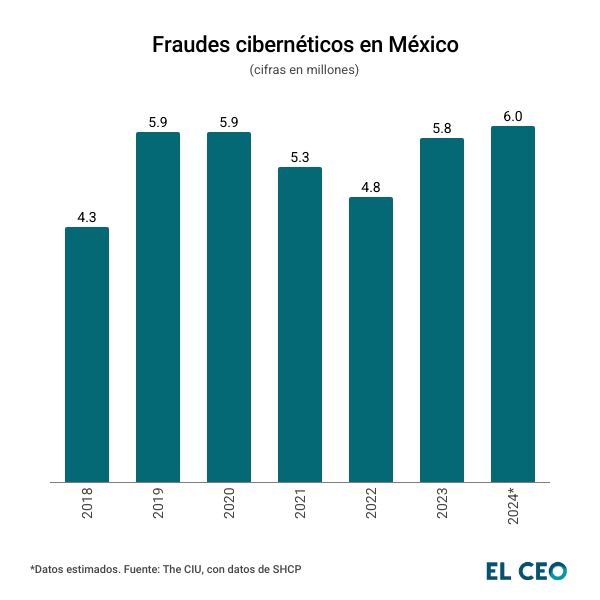 De acuerdo con datos oficiales de la Secretaría de Hacienda y Crédito Público (SHCP), recopilados por The Competitive Intelligence Unit (CIU), en 2024, México registro cerca de 6 millones de fraudes cibernéticos, que es un aumento de 40% con relación a 2018.