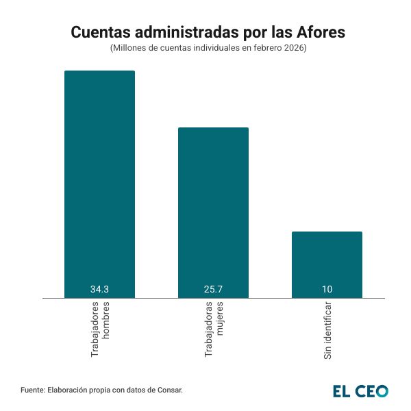 En febrero de 2026, 25.7 millones de cuentas individuales administradas por las administradoras de fondos para el retiro (Afores) pertenecían a mujeres, en comparación con 34.3 millones pertenecientes a hombres, mientras que casi 10 millones de cuentas se encontraban sin identificar, de acuerdo con datos de la Comisión Nacional del Sistema de Ahorro para el Retiro (Consar).