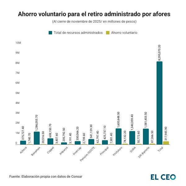 Al cierre de noviembre, de los más de 8.2 billones de pesos administrados por las afores, solo 3.8% correspondieron a ahorro voluntario y solidario, de acuerdo con datos de la Comisión Nacional del Sistema de Ahorro para el Retiro (Consar).