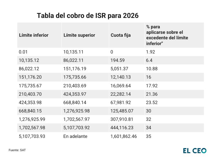 De acuerdo con la Resolución Miscelánea 2026, la tabla de ISR del SAT para 2026 quedará de la siguiente manera: