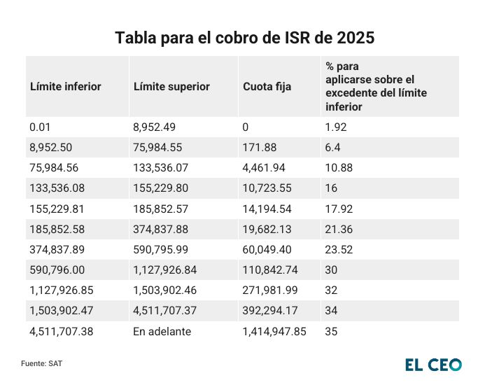 En otro caso, las personas que ganaban entre 8,953 y 75,984.55 pesos durante 2025 tenían que pagar una cuota fija de 171.88 pesos, además de una tarifa de 6.40% sobre el excedente del límite inferior. Con los nuevos ajustes, esta cuota fija y la tarifa de ISR será para las personas que perciban de 10,135.11 a 86,022.11 pesos.